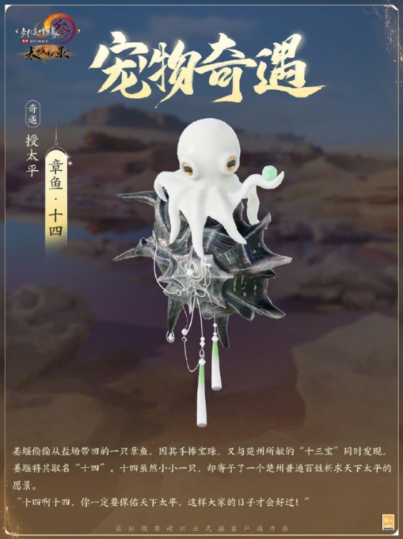 姜堰偷偷从盐场带回的一只章鱼,因其手捧宝珠,又与楚州所献的“十三宝”同时发现姜堰将其取名“十四”。十四虽然小小一只,却寄子了一个楚州普通百姓祈求天下太平的愿景。