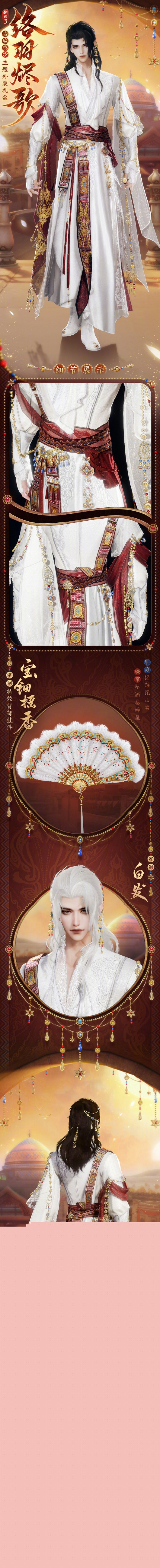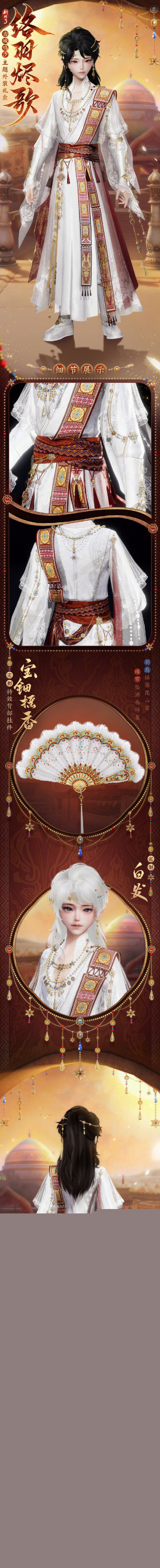 络羽烬歌是剑网3古城鸣沙主题时装,那么该时装长什么样呢,时装整体以白色为主,红色为辅色,再用少量的金色做点缀,礼盒还包含定制白发白发和特效背部挂件宝钿摇香,接下来就由小编给大家带来了详细的《剑网3》古城鸣沙主题外装络羽烬歌外观一览!