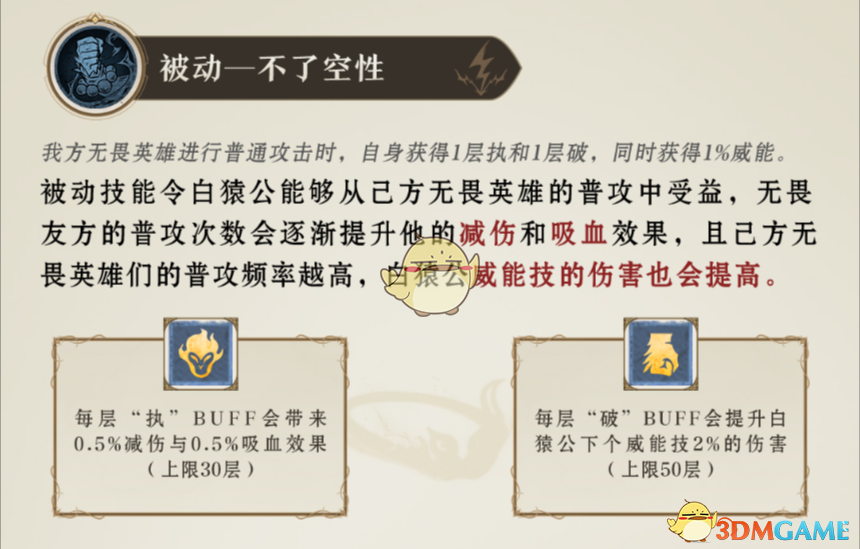 构建无畏阵容,激活电光亲和,白猿公是一位契合无畏流配队的输出英雄,同流派英雄进行普攻不但能为其叠加被动层数还能使白猿公额外获得威能,解锁五人元素亲和后,再搭配同为电光亲和组的闪电或光耀元素辅助英雄,还能使队伍拥有更高的发挥上限。