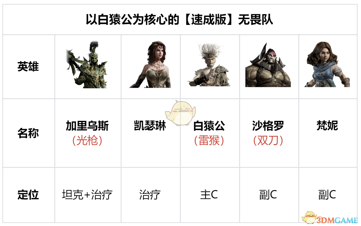 该阵容以白猿公为输出核心,要让雷猴的威能技又快又疼,高攻速的无畏队友必不可少。