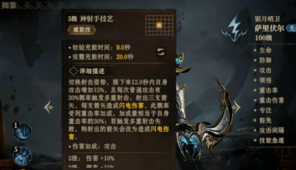 角色还有一个名叫神射手技艺的威能技,使用这个技能之后,角色会在游戏里不断切换射击的姿势,并且在这个过程中,攻击能力可以不断增加,并且每一次使用普通攻击的时候,有30%的概率能触发多重的射击,每次在攻击的时候不是单纯的射出一支箭,而是可以一次性的射出三支箭,这样就可以让角色的伤害直接翻倍,每一支箭在攻击的时候,都有一定的概率能带来额外的闪电伤害,利用这项技能提升角色以及整个队伍的战斗能力。