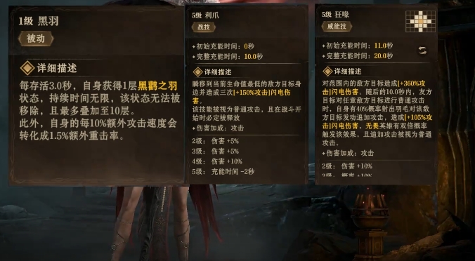 同时被动产生的同时她自身的每10%额外攻击速度会转化成1.5%额外重击率,而黑鹳之羽状态能为纳斯婕卡带来5%的攻击速度加成,再来说说她的战技利爪,可以快速移动的同时造成三次超过150%攻击的闪电伤害,该技能被视为普通攻击,这意味着在战斗节奏上能够更好地与其他技能和普通攻击进行衔接,并且在战斗开始时,这个技能必定被释放,这给了队伍在开场时就取得优势的机会。
