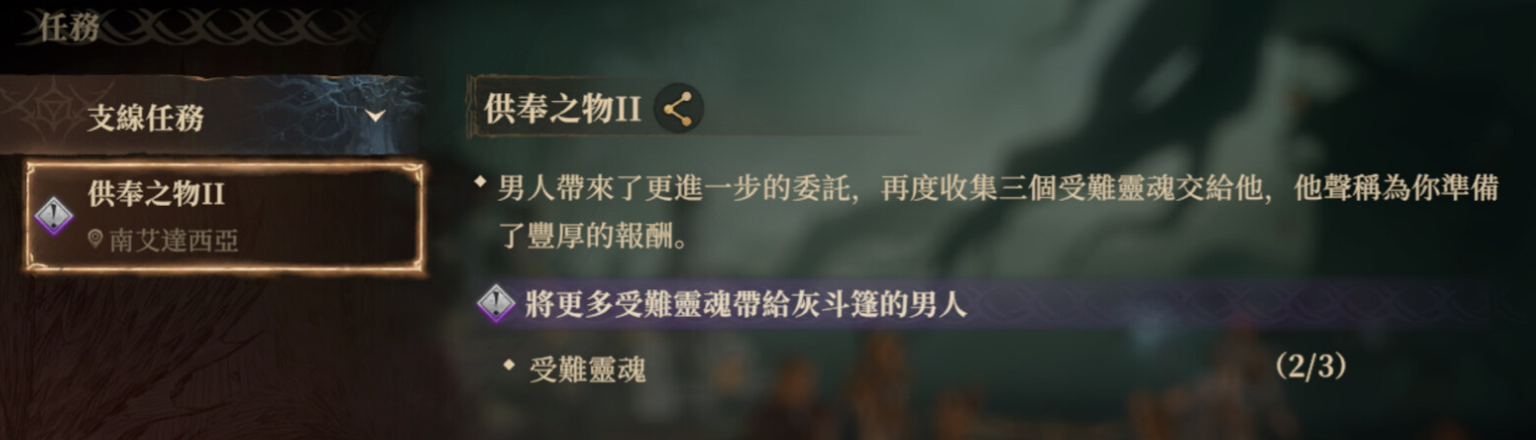 游戏中这个支线任务是许多朋友们都非常好奇的,大家需要收集到三个受难的灵魂,在可以顺利的完成,作为供奉之物的第二个系列任务,只要完成之后,就会给予大家丰厚的奖励,这个任务其实并不是特别的复杂,这三个灵魂都会集中在一张地图上,玩家们一定要查漏补缺,找到漏洞的怪物进行攻打,地图上还会有迷雾遮挡,许多的怪物都会被它挡住。