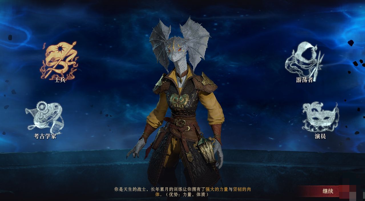 目前游戏内主要的身份只有四种,考古学家和士兵,游荡者和演员,每种身份带来的属性优势都不尽相同。考古学家的属性优势主要体现在脑力方面,感知和智力这两个属性上会有一定程度的提升。