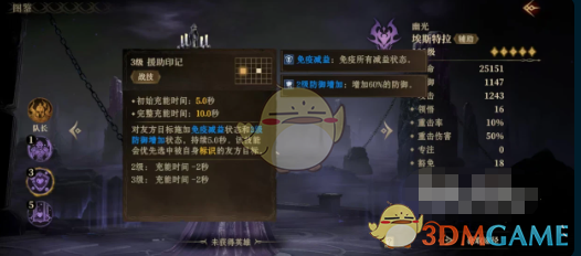 被动技能摇曳烛光,战斗开始时将生命值最低的友方目标标识出来,使其获得所有治疗和护盾效果增加。战技是援助印记,对友方目标施加免疫减益状态和防御增加状态,持续5秒钟,该技能会优先选择被标识的友方目标生效。免疫减益可以使对方免疫所有的减益状态,附加的防御增加为二级效果,增加60%防御。威能技为防护领域,持续施法6秒钟,在这期间,每0.2秒就能对生命值百分比最低的两个友方目标进行治疗。