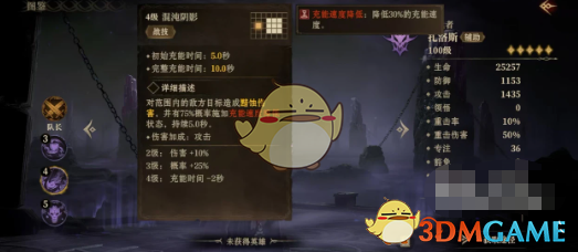战技混沌阴影,伤害范围达到九格,对范围内的敌方目标造成黯蚀伤害,并有75%概率施加充能速度降低状态,有效降低对方充能速度,也就能延缓对方的输出节奏,降低数值为30%,该技能施法范围大影响广泛。威能技怖惧深渊,在指定的地点召唤持续5秒的囚牢,囚牢存在期间,每一秒钟都能对范围内敌方目标造成黯蚀伤害,并有35%几率施加恐惧状态,持续5秒钟,对所有己方目标进行一次治疗,该技能的影响范围更为广泛,几乎覆盖了对方全域。