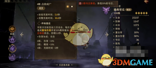 战技点敌成尸,初始充能时间5秒,完整充能时间为10秒,对敌方目标发动三次攻击,每次攻击都能造成黯蚀伤害,并有50%概率施加二级专注降低状态,持续5秒钟。二级专注降低效果能够降低对方50%专注,如果对方非常依赖于专注属性,那么此技能可以对敌方造成极大的削弱。威能技末路穷途,初始充能时间12秒,完整充能时间20秒,选择最多三名敌方目标发动三次攻击,每次都能造成黯蚀伤害。有50%率施加二级攻击降低状态,持续10秒钟,二级攻击降低可以削弱对方50%攻击力。