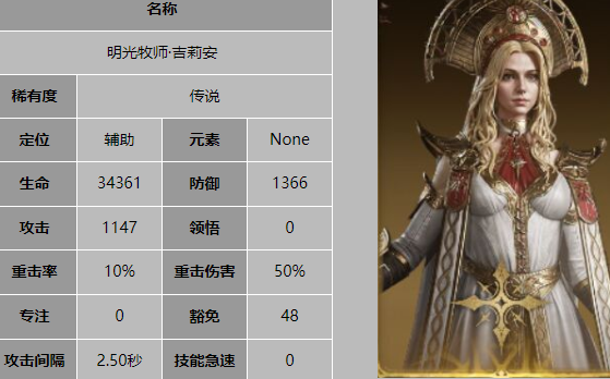 吉莉安是光系辅助中的明星角色,以其强大的治疗能力和增益效果而闻名。她的被动技能“神之恩赐”能在队友生命值低于一定比例时自动触发治疗,同时施加一个持续恢复状态,确保队友在战斗中始终保持最佳状态。战技“神恩降临”更是能为最低生命的队友提供高额治疗,并附加一个持续数秒的伤害减免buff,极大地增强了队友的生存能力。大招“明光领域”则是吉莉安的终极技能,能为全体队友恢复大量生命值,并移除一个减益效果,同时提升全体队友的防御力,为队伍赢得宝贵的喘息时间。