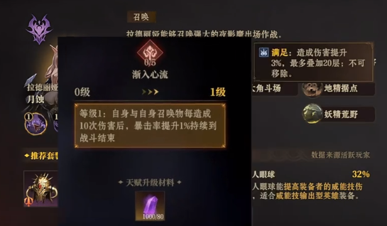 拉德丽娅这一个英雄会有两个天赋,一个是渐入心流,另外一个是物影迷踪。分别就可以叠加暴击率,同时也可以反弹敌人的伤害。同一个英雄同样也会有对应的流派体验,可以通过天赋重修机制然后退还。