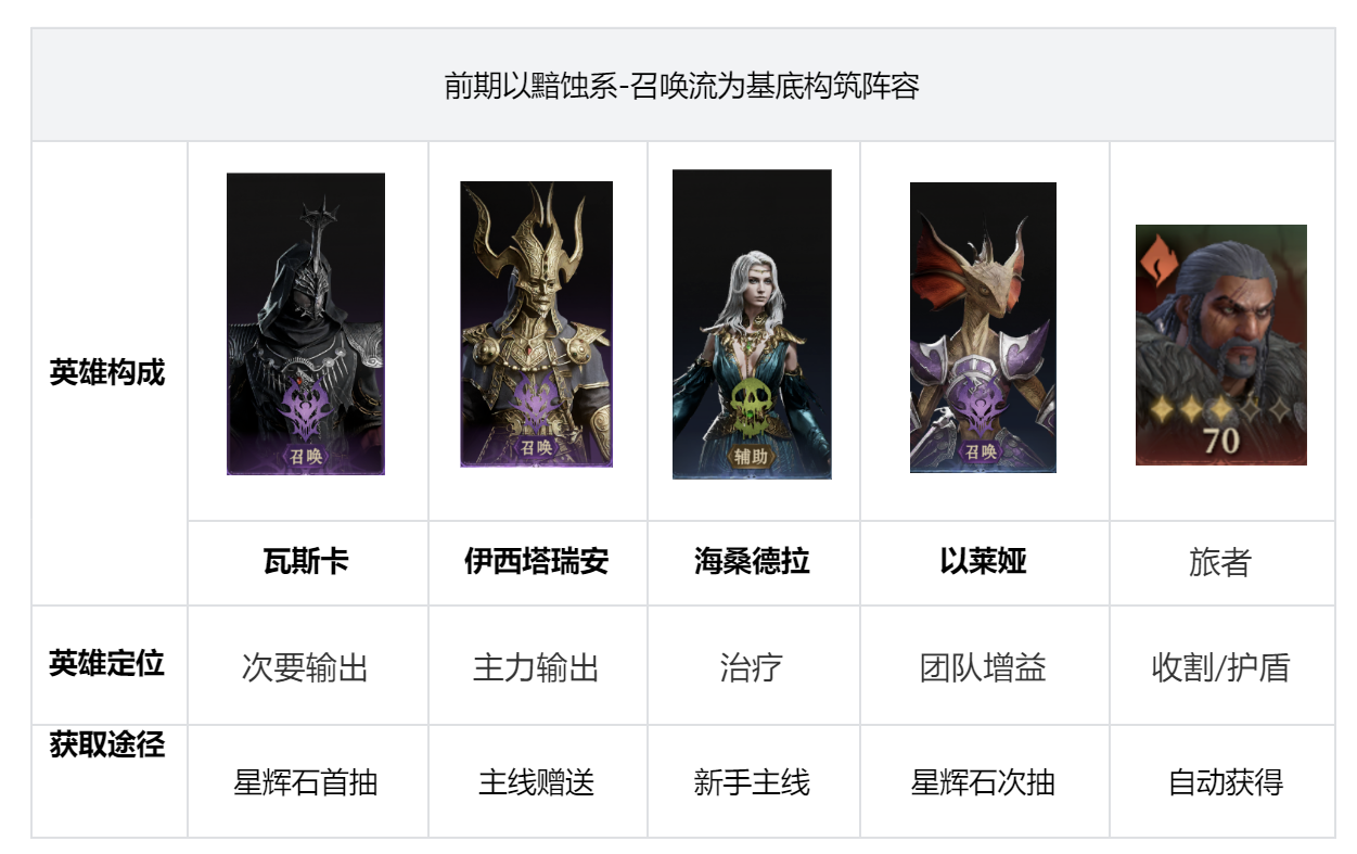 这是一套主线剧情初期就能组建完成的开荒阵容,如下: