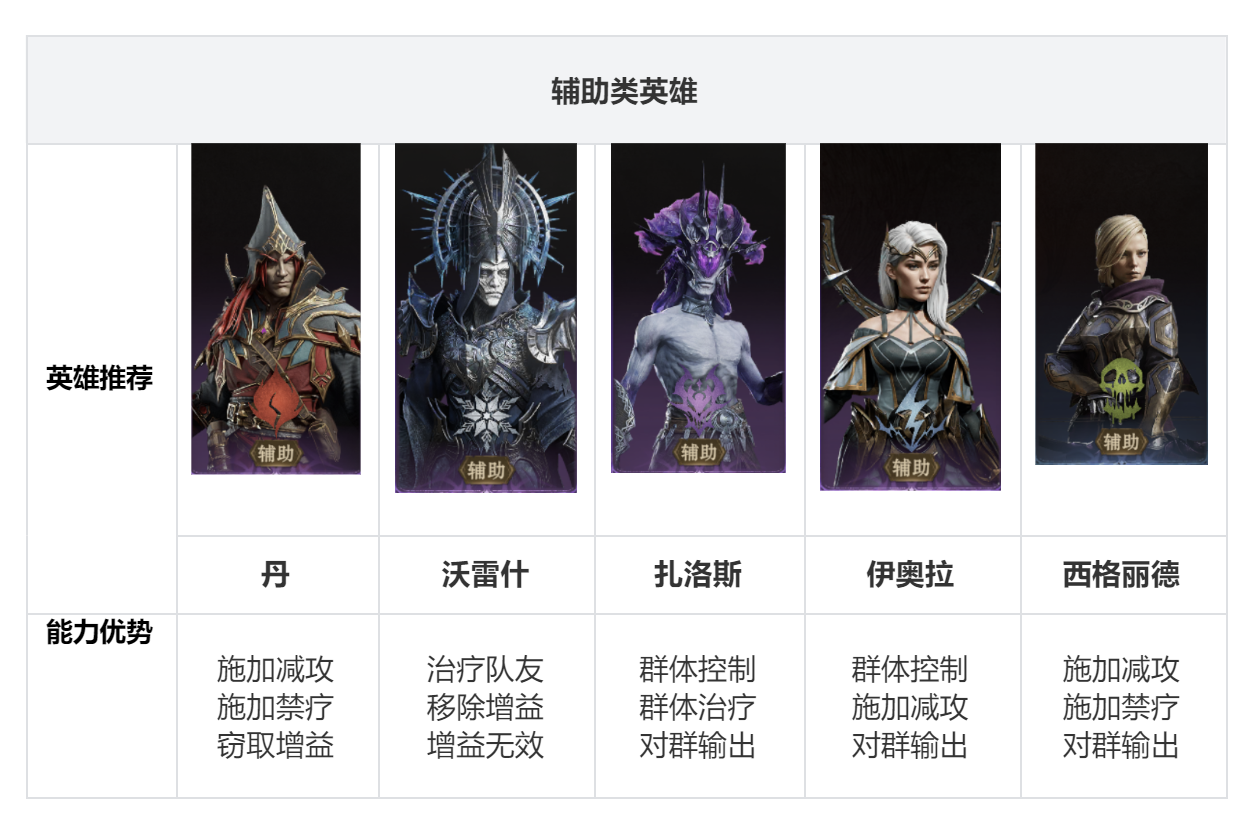 至少保证1名防御类英雄+1名治疗型辅助,根据二者的坦度及治疗量,视情况补充副坦或更多奶妈,也可以选择能够增强团队生存能力(护盾/减攻/加防等)的辅助英雄。
