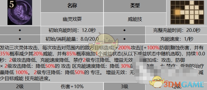 这项技能初始充能时间为12.0秒,完整充能时间为20.0秒,使用这个技能时他会发动三次灵体攻击,每次攻击对范围内的敌方目标造成+200%攻击,然后+100%防御的黯蚀伤害,同时有35%的概率减少目标20%的威能,并且有85%的概率施加一个减益状态,从减益状态中随机选取,持续10.0秒,2级攻击降低、充能速度降低、禁疗2级专注降低、增益无效的影响。