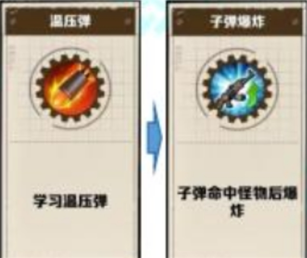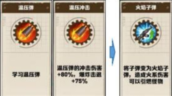 火子弹:在游戏当中除了个别免疫火系的怪不能命中之外,火子弹相比其他属性子弹伤害最高,且可以附带燃烧,有了温压弹还可以出爆炸词条。但是缺点是不能分裂,也没有控制。火子弹可以命中免疫物理怪如机械开垦者首领(钻头怪),因此当遇到此类型的怪我们就必须去更改我们的子弹属性。火子弹在我们没有去除前置词条的情况下,需要学习温压弹同时还需要选上温压冲击词条之后才会出现火子弹词条。