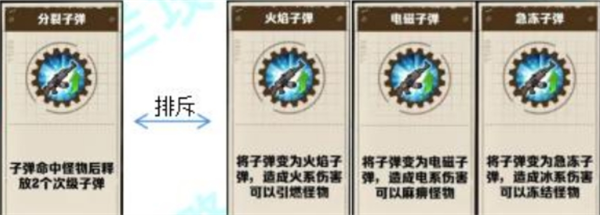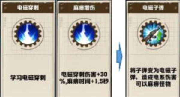 电了弹:选中电磁子弹后,子弹由物理系变为电系伤害,且可以对怪物造成麻痹效果,可以打一手短暂控制效果。
