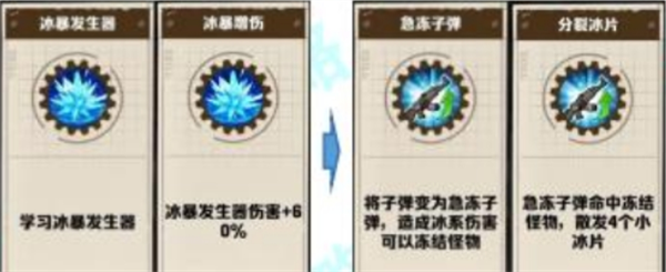 冰子弹:选中冰子弹后,子弹由物理系变为冰系伤害,且可以对怪物造成冻结效果,可以打一手短暂冰冻效果。