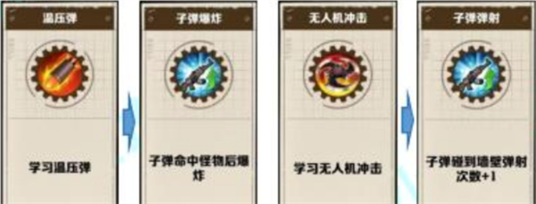 不需要前置的子弹词条:子弹增伤、连发、齐射、极速射击。剩余其他词条都是需要有对应前置才会出如子弹爆炸范围和子弹爆炸增伤都是需要子弹先有爆炸,全子弹增幅也是需要现有次级子弹之后才会出。在图内想把枪械养起来就需要不断多选枪械词条,枪械发育会比较慢,因此我们就需要其他技能打配合杀小怪。