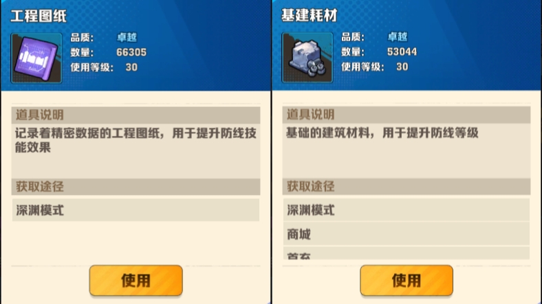 基建耗材可以升级防线等级,工程图纸可以升级防线技能,两者都是这个游戏比较重要的材料