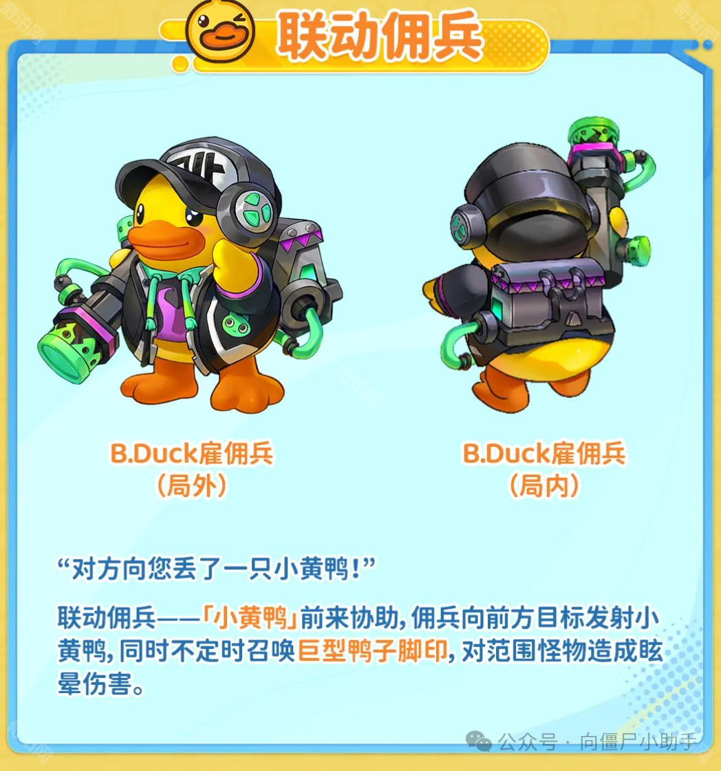 向僵尸开炮宣布将和B.Duck展开联动,联动期间我们可以获得联动专属城墙、联动专属佣兵和联动专属头像框、聊天框和称号。下面是小编给大家带来的《向僵尸开炮》B.Duck联动活动介绍,感兴趣的小伙伴们一起来看看吧。