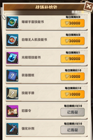 后期:招募令、强化补给、机枪大兵、精准狙击手。