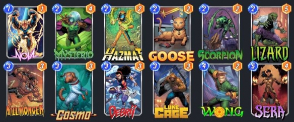 塞拉控制的变种构筑,依靠生化女与卢克凯奇的联动效果对小战力铺场类卡组进行弱化,值得一提的是在没有卢克凯奇的时候生化女更像是一把双刃剑,谨慎使用;蜥蜴的副作用与卢克凯奇也拥有一定的联动效果,在有魔形女的情况下,您也可以考虑加入王+魔形女+生化女的操作。