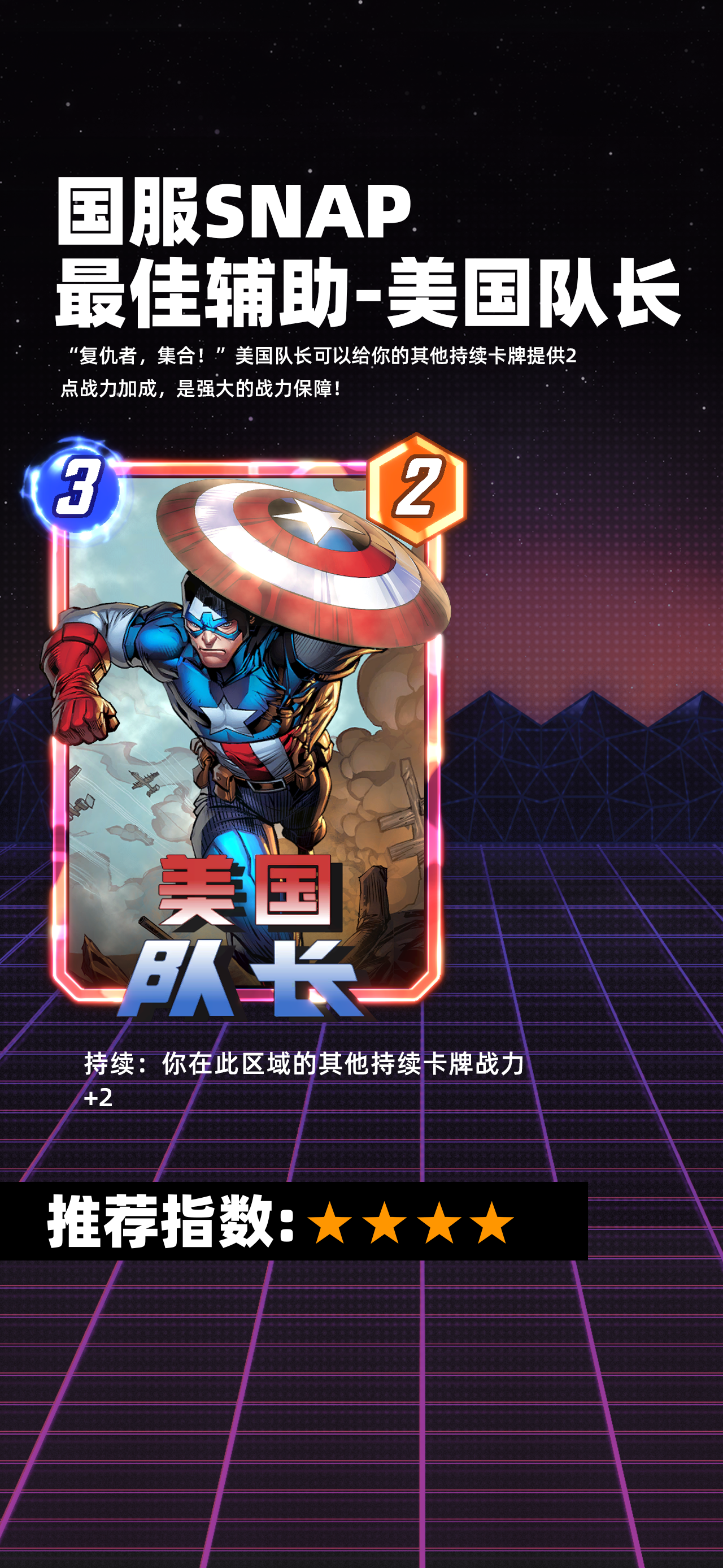 美国队长在漫威终极逆转游戏中,他拥有3-2的身材,能力上看也体现了原作中其强大的领导能力:持续:你在此牌所在区域的其他持续卡牌+2战力。较差的身材和一般的能力让该卡处于比较尴尬的地位,出了新手村后用的人不多,卡牌强度推荐指数:4分。接下来给大家带来了《漫威终极逆转》美国队长获取方法!