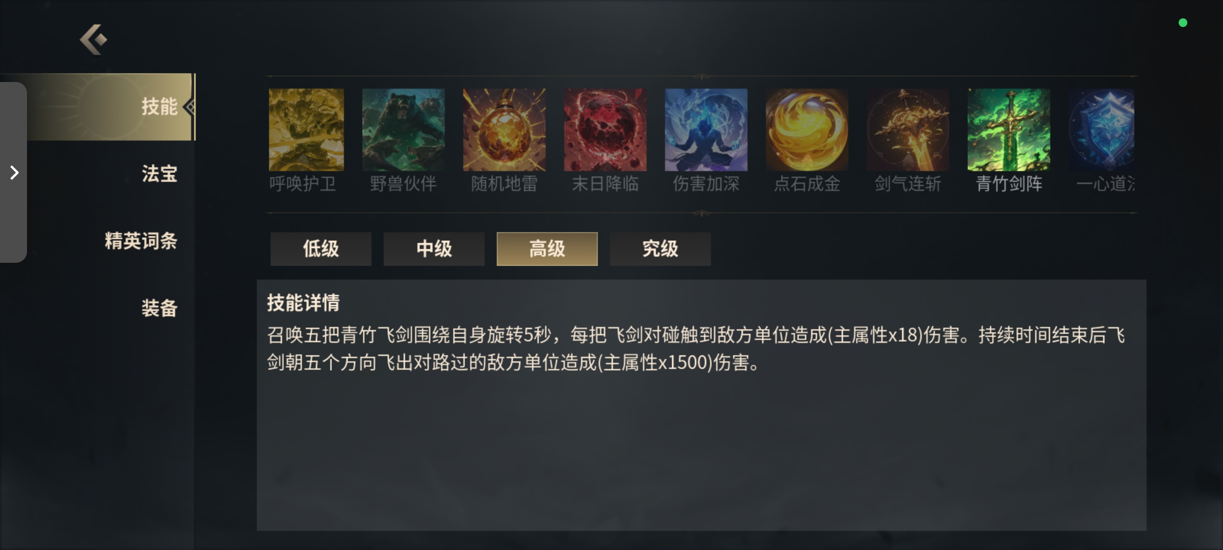 被动技能 神圣之剑,主动技能 青竹剑阵,这两个技能是核心!!!!全靠这两个技能打伤害。