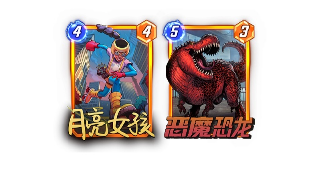 毫无疑问的新手福音,也是手牌流最常见的获胜手段,开服6元礼包最高性价比的含金量!要知道,每位玩家都在对局开始都会先抽3张牌作为起始手牌,如果按照每回合抽1打1的正常节奏,4费回合拍下【月亮女孩】将会把手牌数量补充至6张,那么【恶魔恐龙】的战力将会来到恐怖的5-15,这对于任何一位新手玩家都是望尘莫及的(要知道无敌的【浩克】也才有6-12的身材)。如果我们成功复制到多一张【恶魔恐龙】,甚至可以实现5、6回合双拍大哥的强势局面。这套组合技的优势在于,即便你玩的不是手牌流卡组,单纯是这套combo打出就已经能起到一锤定音的效果。