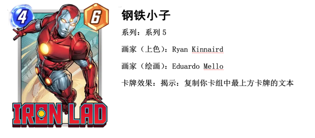 2、思路介绍首先钢铁小子这张卡的身材在四费卡中是不亏战力的标准身材,那么也就是说这张卡就算没有复制到有用的卡,你在4费准时打出,他也是一张不亏的卡,当然如果能复制到优秀的好卡,这张卡更是可以发挥意想不到的强大,比如:复制钢铁侠、复制惊奇队长,都能让你在4费这一轮次取得极大的节奏点,同时这张卡只要复制得好,你及时的点下snap,你的对手也将产生巨大的心理压力,毕竟谁能在看到对手打出一张4-6的钢铁侠的时候不感到害怕呢。