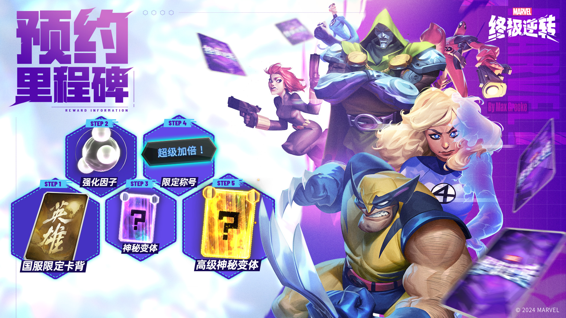 预约里程碑奖励全部解锁!公测正式开启后,所有玩家登录游戏后可前往收件箱领取国服限定英雄卡背*1,强化因子”*35,神秘变体*1,限定称号-“超级加倍!”,高级神秘变体*1