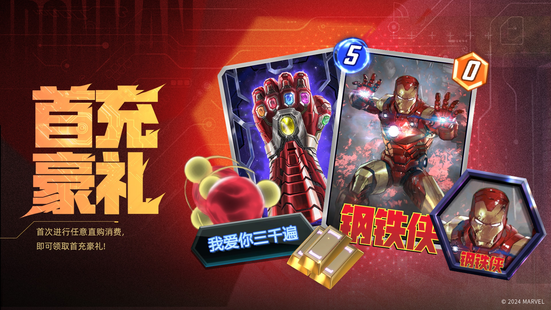 如果探员正巧购买了6月国风超值礼包或充值了任意金额,即可领取:钢铁侠变体*1(国际服累充200美元才可获得)、纳米无限手套卡背*1、钢铁侠头像*1、称号-我爱你三千遍、钢铁侠强化因子*155、金块*100
