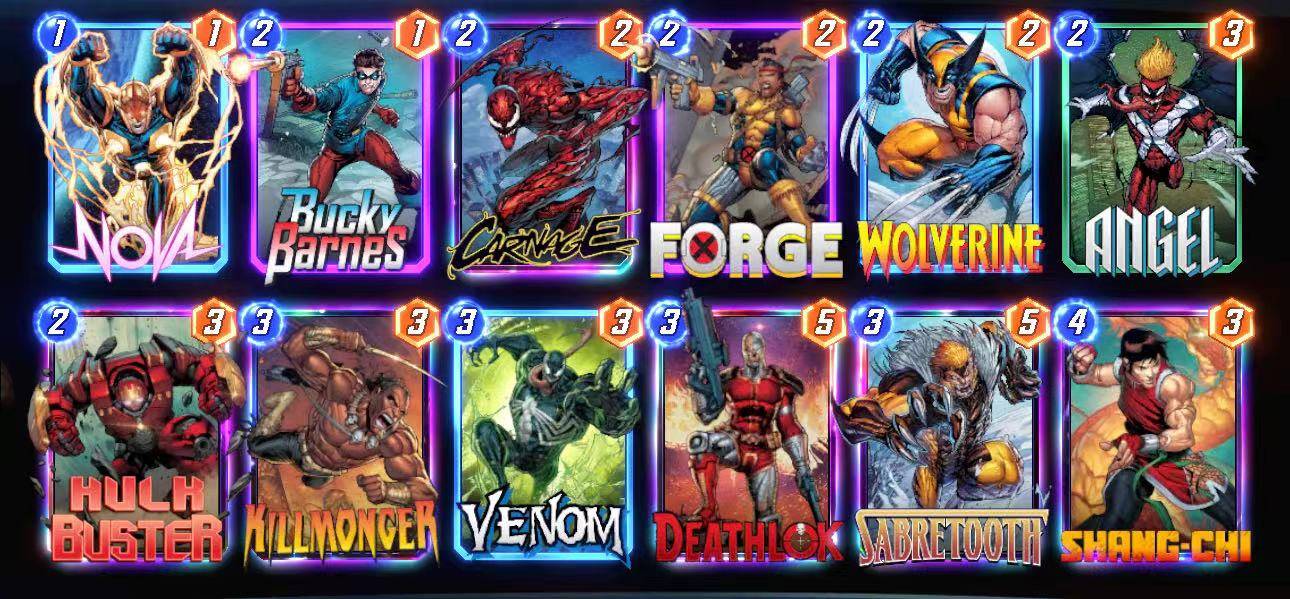 # (1) Nova# (2) Bucky Barnes# (2) Carnage# (2) Forge# (2) Wolverine# (2) Angel# (2) Hulkbuster# (3) Killmonger# (3) Venom# (3) Deathlok# (3) Sabretooth# (4) Shang-Chi#eyJDYXJkcyI6W3siQ2FyZERlZklkIjoiTm92YSJ9LHsiQ2FyZERlZklkIjoiQnVja3lCYXJuZXMifSx7IkNhcmREZWZJZCI6IkNhcm5hZ2UifSx7IkNhcmREZWZJZCI6IldvbHZlcmluZSJ9LHsiQ2FyZERlZklkIjoiSHVsa2J1c3RlciJ9LHsiQ2FyZERlZklkIjoiS2lsbG1vbmdlciJ9LHsiQ2FyZERlZklkIjoiVmVub20ifSx7IkNhcmREZWZJZCI6IkRlYXRobG9rIn0seyJDYXJkRGVmSWQiOiJTYWJyZXRvb3RoIn0seyJDYXJkRGVmSWQiOiJTaGFuZ0NoaSJ9LHsiQ2FyZERlZklkIjoiQW5nZWwifSx7IkNhcmREZWZJZCI6IkZvcmdlIn1dfQ==## To use this deck, copy it to your clipboard and paste it from the deck editing menu in Snap.核心卡牌:毒液、金刚狼
