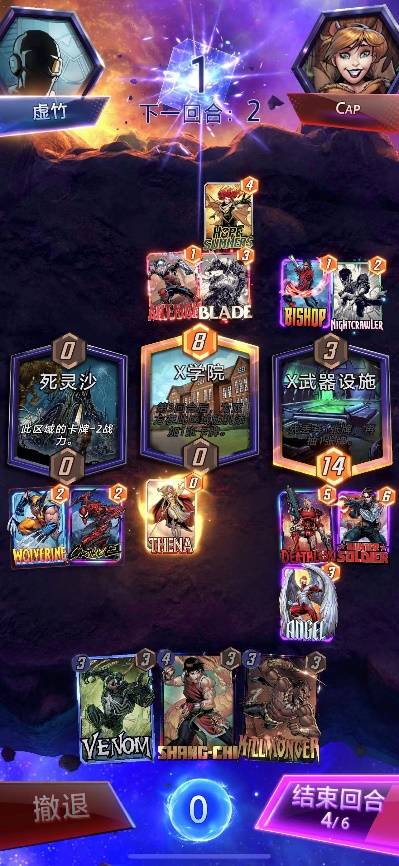 第四回合:每回合尽量把费用打完,这里中路出了蒂娜,那我们尽量每回合打两张牌,这里要打金刚狼和屠杀,那只能打在一路。
