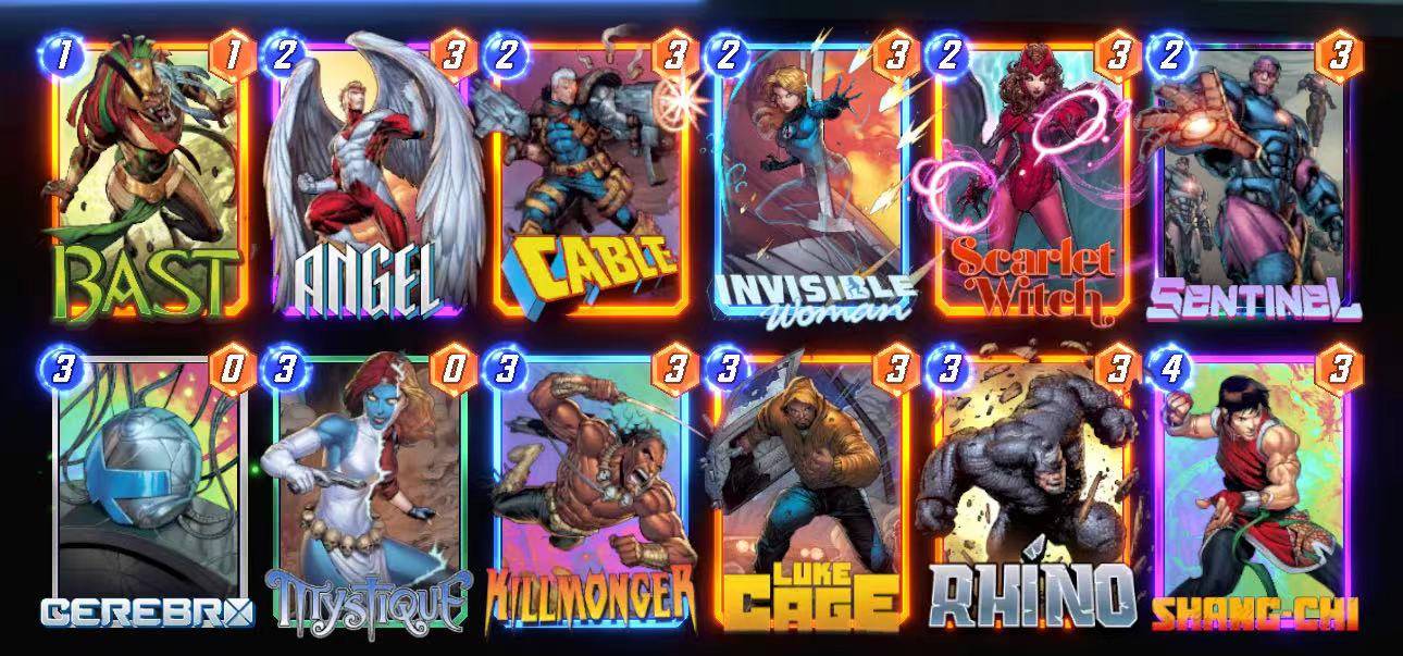 # (1) Bast# (2) Angel# (2) Cable# (2) Invisible Woman# (2) Scarlet Witch# (2) Sentinel# (3) Cerebro# (3) Mystique# (3) Killmonger# (3) Luke Cage# (3) Rhino# (4) Shang-Chi#TGtDZzgsQ3JicjcsQnN0NCxDYmw1LEludnNibFdtbkUsU2NybHRXdGNoQyxTbnRubDgsTXN0cTgsS2xsbW5nckEsUmhuNSxTaG5nQ2g4LEFuZ2w1## 要使用此卡组,复制它到你的剪切板后,在MARVEL SNAP中打开卡组编辑界面进行粘贴。