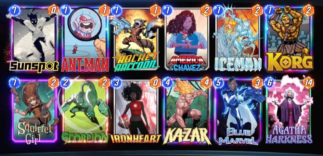 # (1) Sunspot# (1) Ant Man# (1) Rocket Raccoon# (1) America Chavez# (1) Iceman# (1) Korg# (1) Squirrel Girl# (2) Scorpion# (3) Ironheart# (4) Ka-Zar# (5) Blue Marvel# (6) Agatha Harkness#eyJDYXJkcyI6W3siQ2FyZERlZklkIjoiU3Vuc3BvdCJ9LHsiQ2FyZERlZklkIjoiQW50TWFuIn0seyJDYXJkRGVmSWQiOiJSb2NrZXRSYWNjb29uIn0seyJDYXJkRGVmSWQiOiJBbWVyaWNhQ2hhdmV6In0seyJDYXJkRGVmSWQiOiJJY2VtYW4ifSx7IkNhcmREZWZJZCI6IktvcmcifSx7IkNhcmREZWZJZCI6IlNxdWlycmVsR2lybCJ9LHsiQ2FyZERlZklkIjoiU2NvcnBpb24ifSx7IkNhcmREZWZJZCI6Iklyb25oZWFydCJ9LHsiQ2FyZERlZklkIjoiS2FaYXIifSx7IkNhcmREZWZJZCI6IkJsdWVNYXJ2ZWwifSx7IkNhcmREZWZJZCI6IkFnYXRoYUhhcmtuZXNzIn1dfQ==## To use this deck, copy it to your clipboard and paste it from the deck editing menu in Snap.