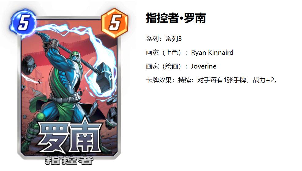 卡组中有主题模组、莫多男爵、麦西穆斯、黑寡妇四张牌能增加对方手牌,吸收人给对手伤害加倍。此外还带了寇格脏对方牌库,冰人增加对方手牌费用,绿魔污染对方卡位。五回合打出罗南会有大量战力,六回合魔形女复制第二个罗南赢下两路。这套卡组娱乐性较高,即使赢不了也能带来快乐,建议大家抽到罗南的可以试试哦!