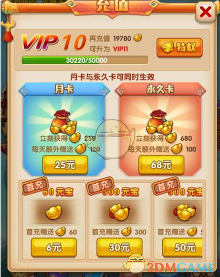 月卡25元:立即获得250元宝,每天额外赠送120元宝