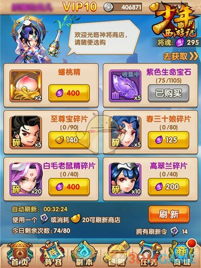2.神将商店:游戏中可是非常容易刷出整个橙将的,可以直接用将魂、元宝购买。