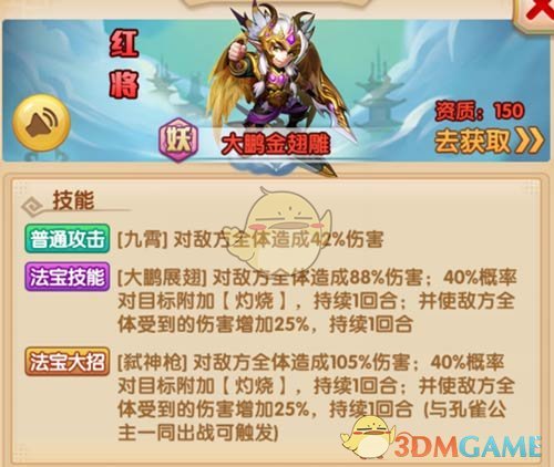法宝技能:【大鹏展翅】对敌方全体造成88%伤害;40%概率对目附加【灼烧】,持续1回合;使敌方全体造成的伤害增加25%,持续1回合