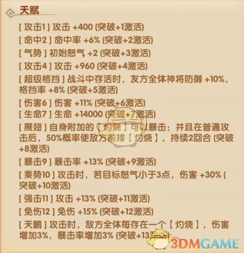 13.天鹏:攻击时,敌方全体每存在一个【灼烧】,伤害增加3%,暴击率增加3%(突破+13激活)