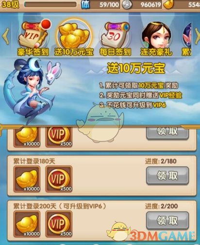 少年游记中有一个福利就是每天登陆都可以获得VIP经验值,当达到升级VIP的时候就可以获得VIP,最高累计登陆200天就能一分钱不花升到VIP6,享受VIP6的特权。不但如此每天登陆都会送元宝,总计一共送10W的元宝,小编个人认为还是非常的良心的,虽说这是游戏想要留住你的一个玩法,不过对于那些想要一直玩下去的玩家来说是非常给力的。