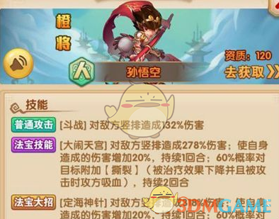 法宝技能:【大闹天宫】对敌方竖排造成278%伤害;使自身造成的伤害增加20%,持续1回合;60%概率对目标附加【撕裂】(被治疗效果下降并且被攻击时攻方吸血),持续2回合
