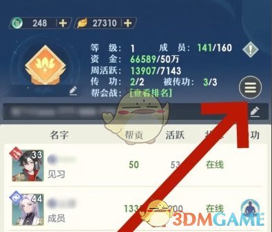 2、接着在帮会玩法中,点击右侧的菜单栏;