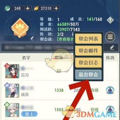 3、随后在弹出的菜单栏内,点击下方的退出帮会;