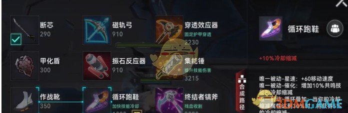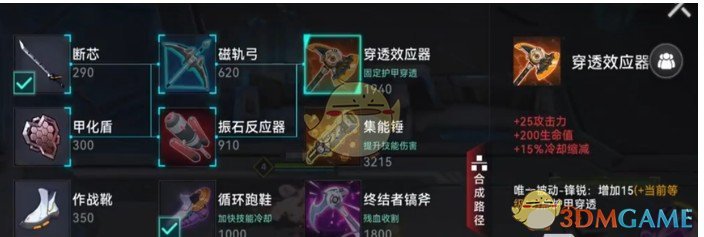 买了鞋子之后的第二件装备就可以选择做穿透效应器,装备的攻击力,血量,冷却缩减以及护甲穿透的属性加成都是前期的洛帕尔最需要的属性,这件装备做完再结合洛帕尔的被动效果,能在前期就达到一个很可观的对线强度。