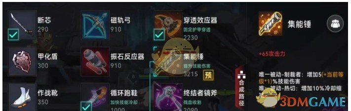 第三件装备就可以选择集能锤了,获得攻击力,生命值和冷却缩减,在出完这件装备之后洛帕尔的技能冷却就已经到达了40%的最高值,但是此时对面的护甲装备大概率都没有成型,所以这个时候的洛帕尔是最强势的阶段。