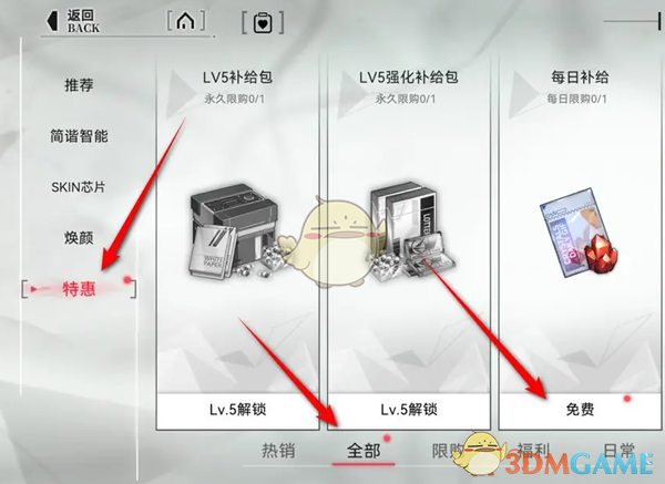 2、进入商城后,点击左侧的特惠,找到每日免费的补给礼包;