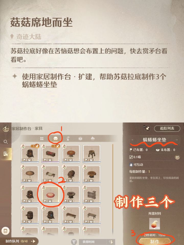 无限暖暖菇菇席地而坐怎么接取,传送至「菇菇大墙」沿着道路找到 苏菇拉底 接取任务,任务需要3个蜗蜷蜷坐垫和一个缤纷花瓶,制作完成后回到对应任务点交付即可。