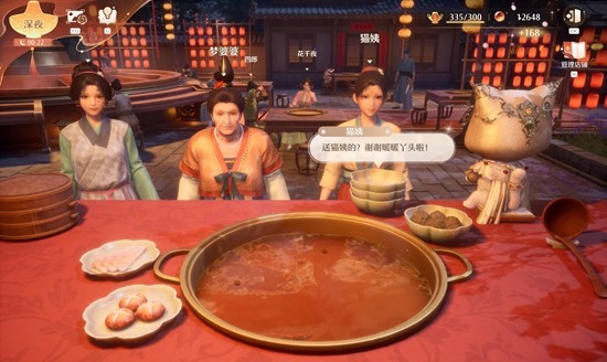 食材可以去火锅旁边的石老板那参加大喵小游戏获取