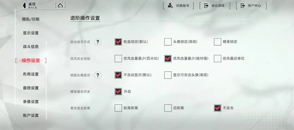 4、进阶操作设置:优先攻击目标选优先血量最少,普攻追击距离选不追击。