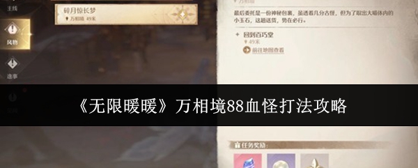 无限暖暖万相境88血怪怎么打?万相境是《无限暖暖》2.2 版本「九色万相生」1 月 30 日上线的永久常驻开放区域,区域含彩蜃城、空鸣峡、九华阙等特色场景,主打东方奇幻市井探索,配套风物任务、探索手记与专属经营玩法。那么新主线应该怎么打怪呢?小编为你准备了一份攻略,一起来看看吧。